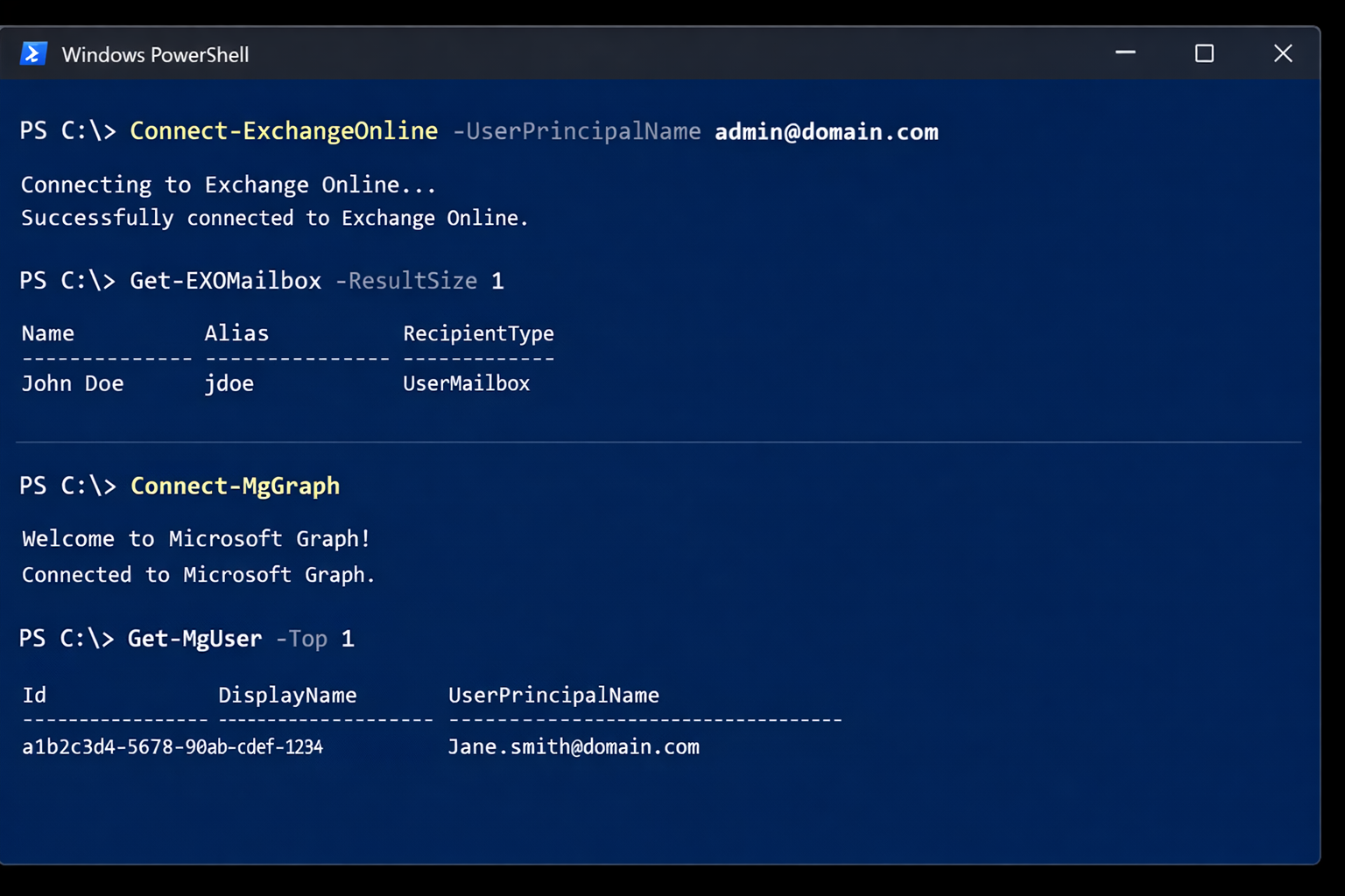 • Exchange Online PowerShell (ExchangeOnlineManagement) for mail, recipients, transport rules, and mailbox settings.